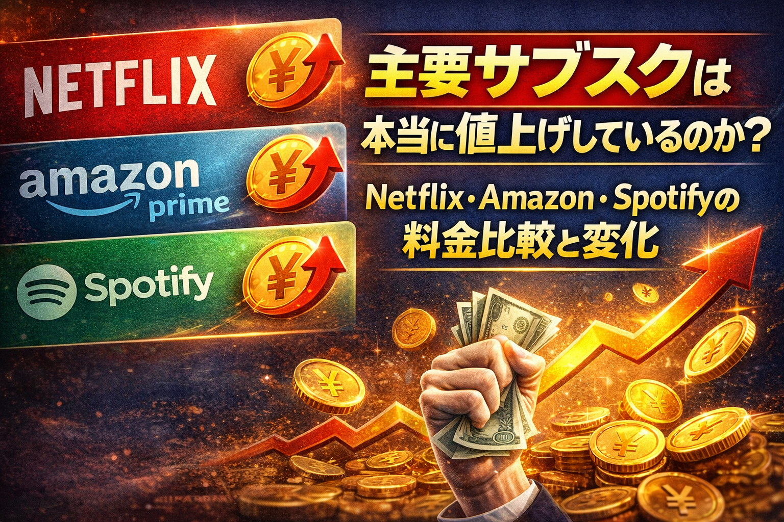 Netflix、Amazon、Spotifyを並べると、主要サブスクは確かに値上げ傾向にあります。ただし、負担増の出方は違います。